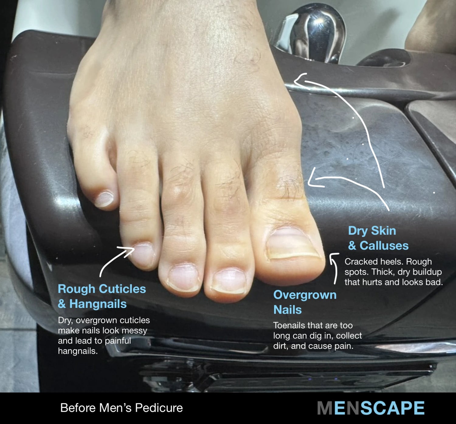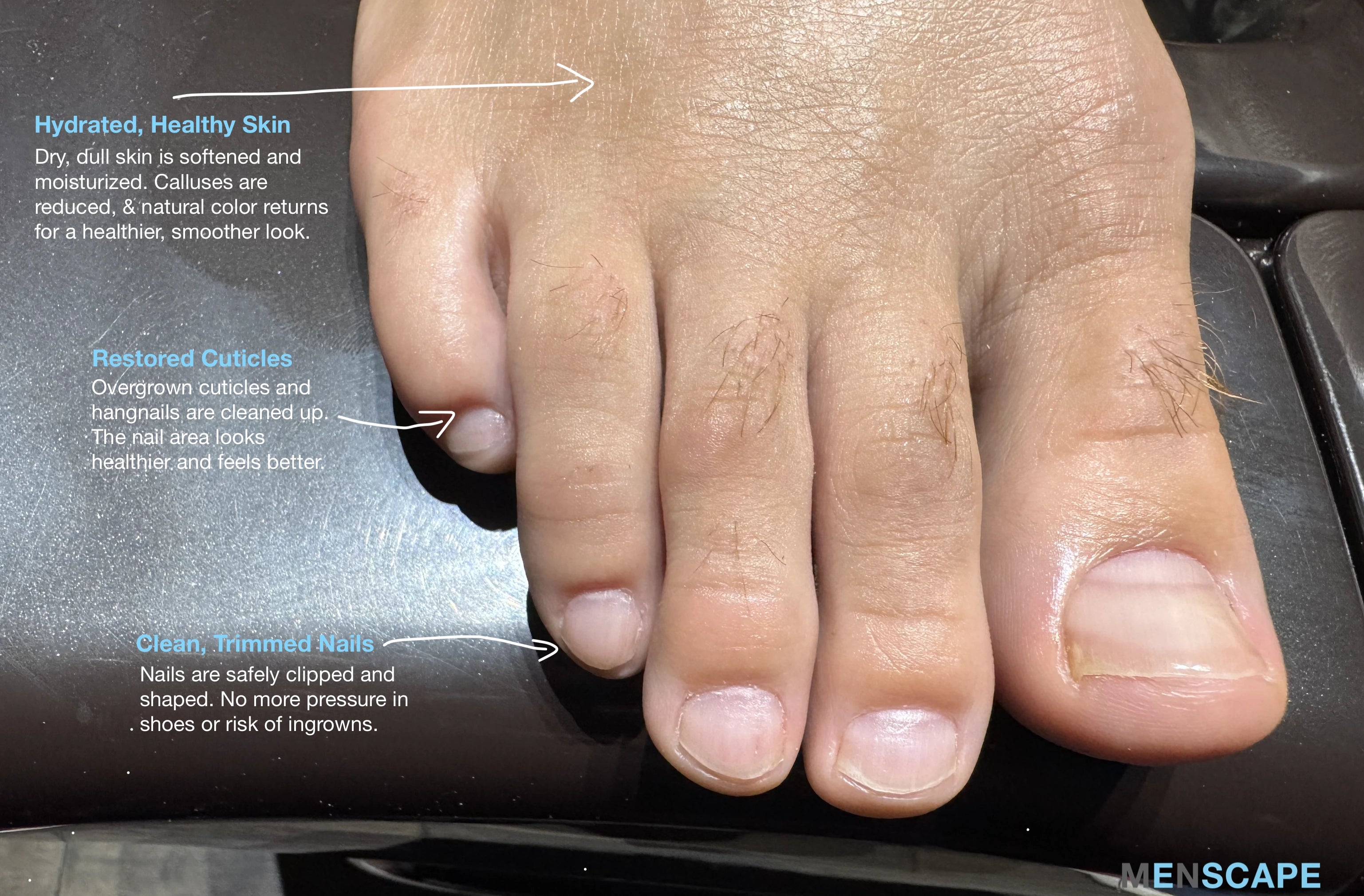 At MENSCAPE, our men’s pedicures are done by a licensed manicurist with skincare and grooming expertise you can trust. We go beyond the basics with precise nail trimming, callus softening, cuticle cleanup, and deep hydration to help prevent hangnails, ingrowns, and cracked heels.